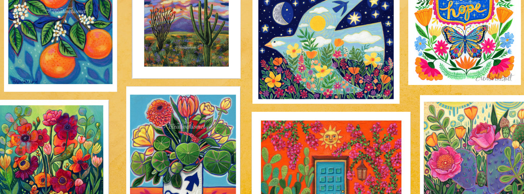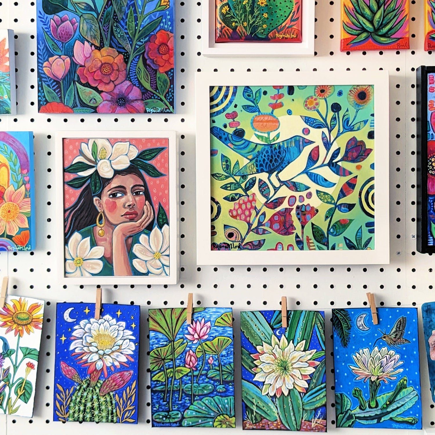 Small art reproductions, paper on wood or wrapped canvas. Great for hanging is small spaces and for gift giving.