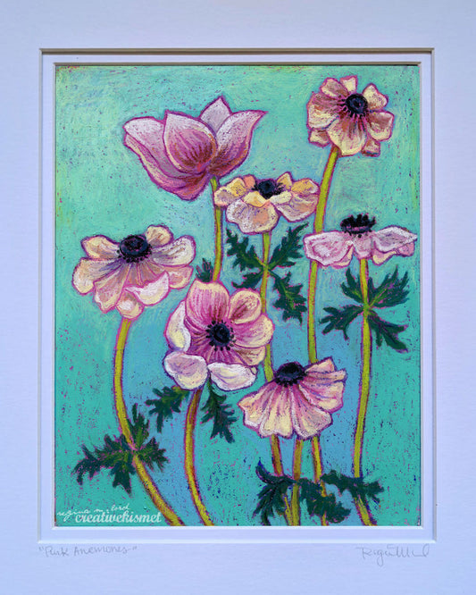 Pink Anemones - 11 x 14 Matted Original Painting - Oil Pastel