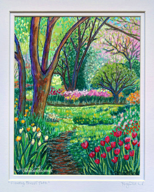 Flowery Forest Path - 11 x 14 Matted Original Painting - Oil Pastel