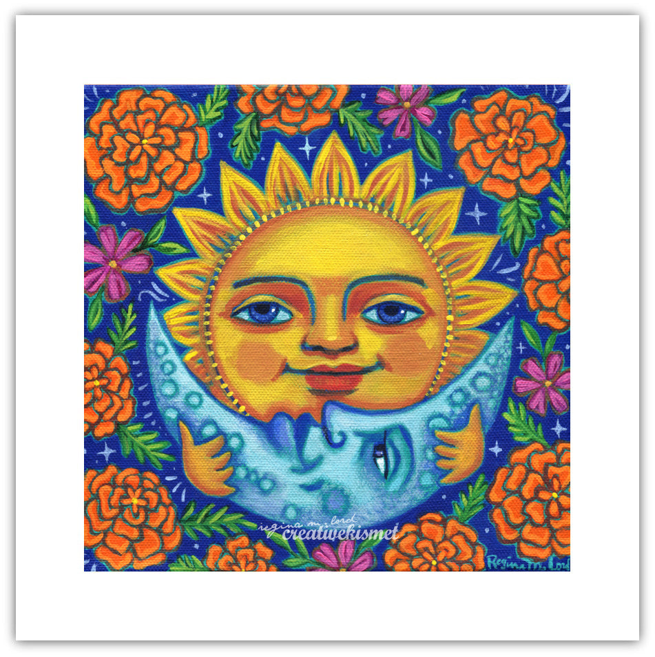 Cempasúchil, (marigolds) to the Aztecs, were a sacred flower believed to have the powerful strength of the sun and represented power, strength, and light that lives within a person. The moon represents calmness, beauty and nurturing.