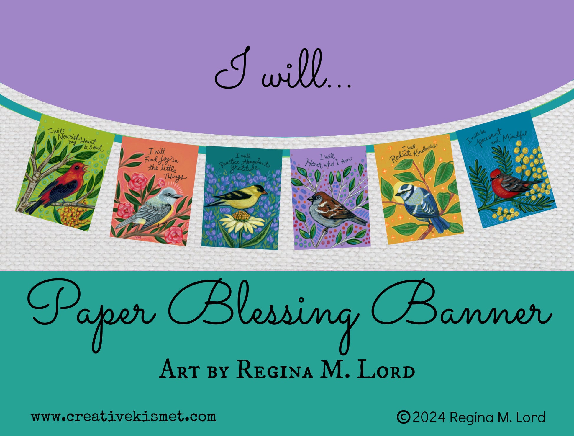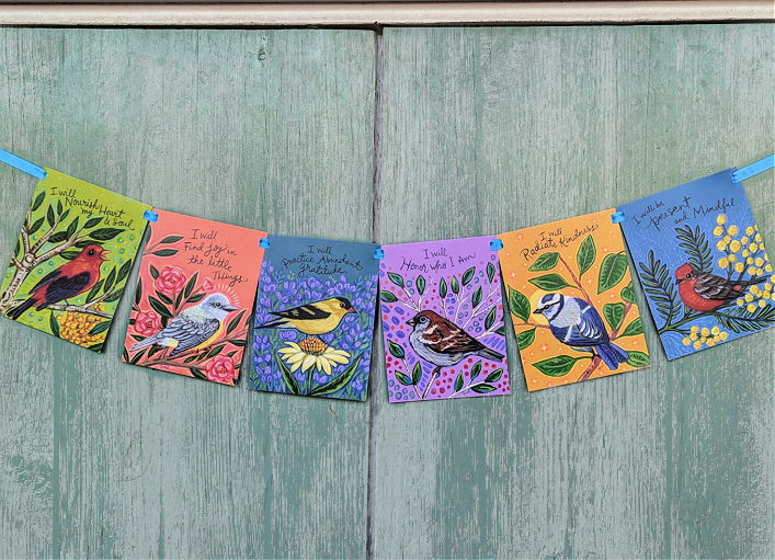 A set of 6 flags, each with it's own inspiring message and beautiful floral designs, made from prints of original art made by me, Regina Lord. They are strung together with ribbon. Ribbon colors vary.