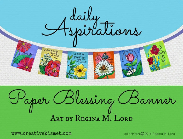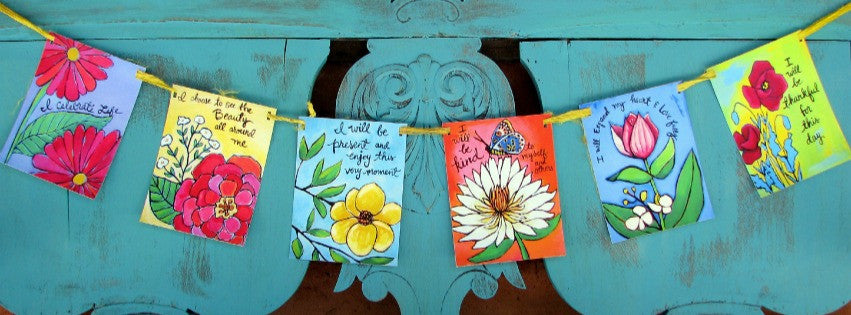 A set of 6 flags, each with it's own inspiring message and beautiful floral designs, made from prints of original art made by me, Regina Lord. They are strung together with ribbon. Ribbon colors vary.